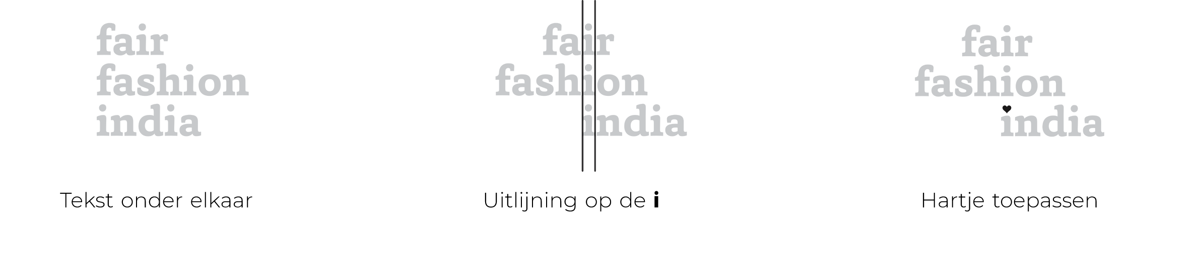 Fair Fashion India is een modebedrijf dat handelt in modeproducten die op een eerlijke wijze zijn gemaakt. Ik kreeg de taak om een woordmerk te maken. Dit om de naamsbekendheid van het merk te vergroten. De drie woorden in de naam, zijn op een elegante en functionele manier onder elkaar gezet.Met als toevoeging een klein visueel trucje om terug te vallen op de eerlijke handel, het hartje op de laatste āiā.