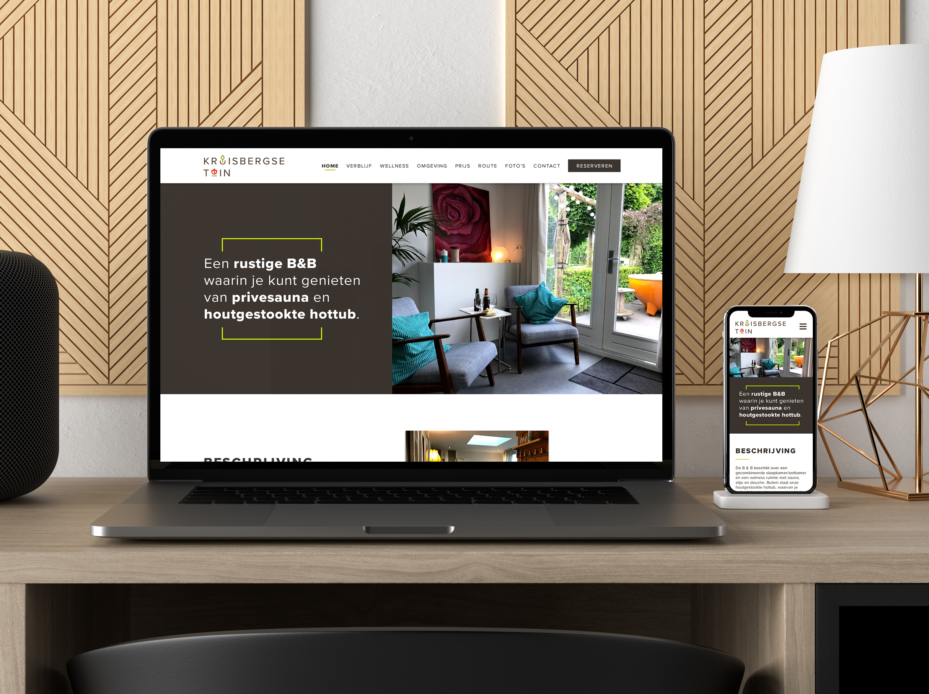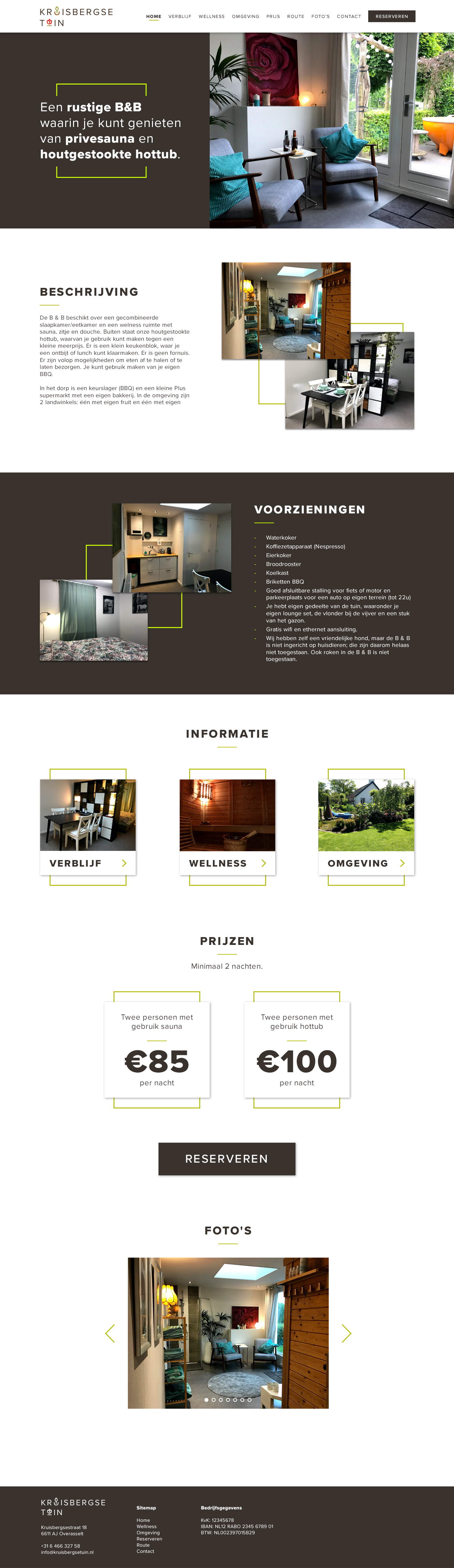 De B & B heeft een relatief moderne uitstraling wanneer je het vergelijkt met de concurrentie in de buurt. Dit is daarom teruggekomen in de huisstijl door een geometrisch lettertype, een felle kleur groen en strakke vormen en lijnen te gebruiken. De groen en bruin is een referentie naar de sfeer rondom het verblijf. Een groene tuin met bruine accenten.